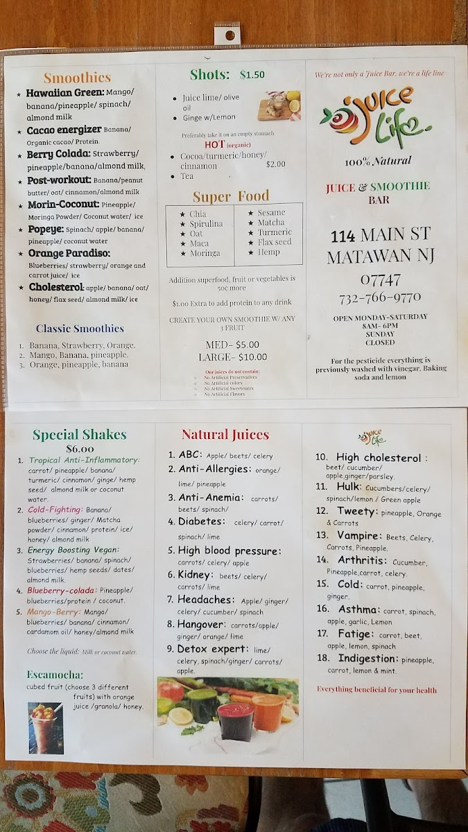 Juice Life, located at 114 Main St, Matawan, NJ 07747, offers a wide and diverse menu catering to various health needs and preferences, making it an excellent choice for those seeking refreshing and nutritious options. Their Classic Juices include beverages like Allergy and Hangover, perfect for those looking for a natural boost. The Detox juice rounds out this section, ideal for anyone looking to cleanse and rejuvenate their system.